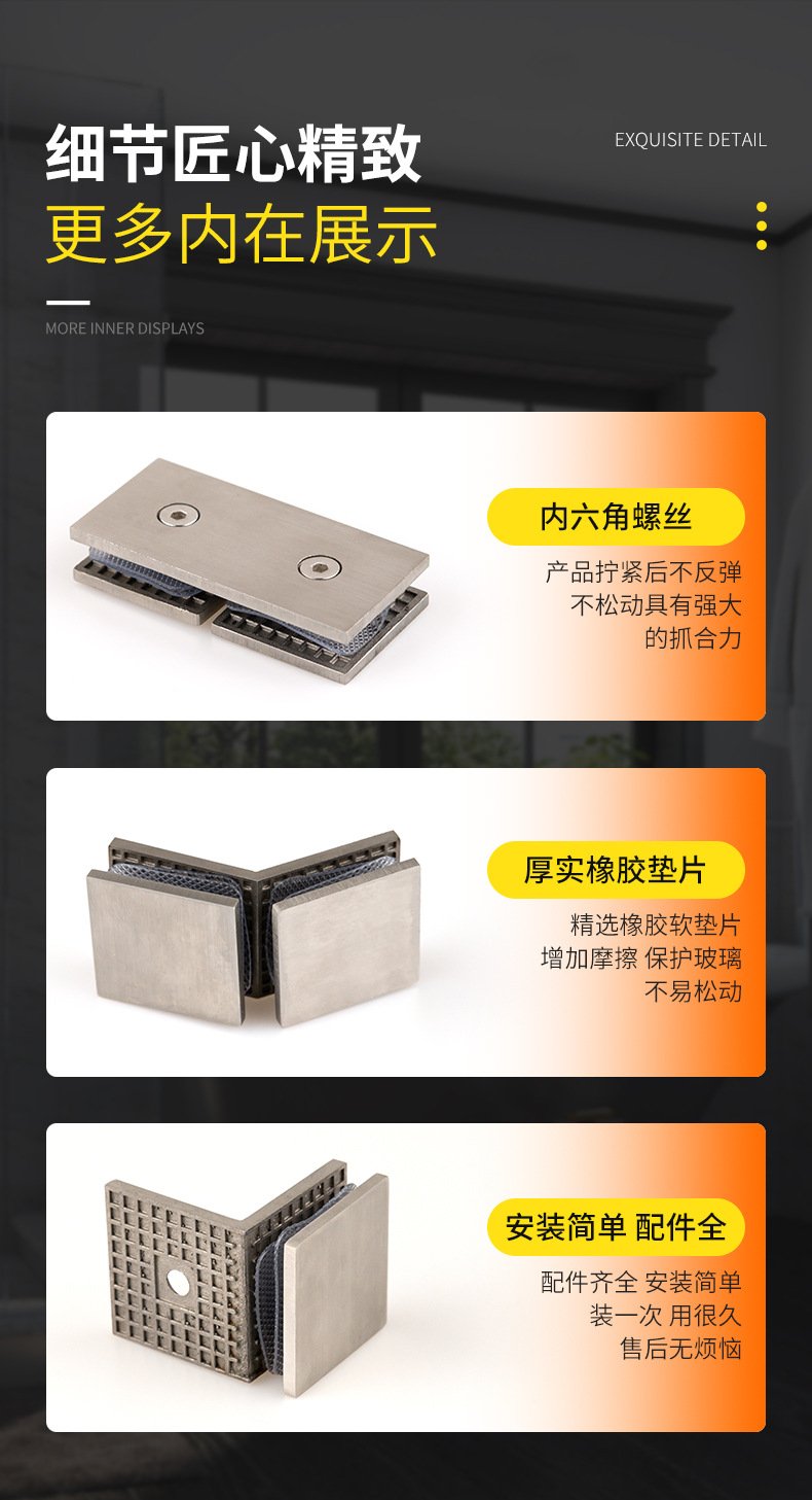Suitable for glass thicknesses of 8 to 12 mm. Uses one-piece tempered glass. For securing fixed glass panels in frameless shower enclosures. This clamp is a better choice than traditional U-grooves as it helps create an “all-glass” look.
