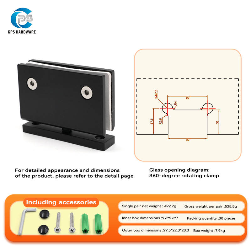 Functions: Frameless glass door clamp can rotate 360 ​​degrees, position 90 degrees, open in both directions, and automatically closes when the angle is below 25 degrees.