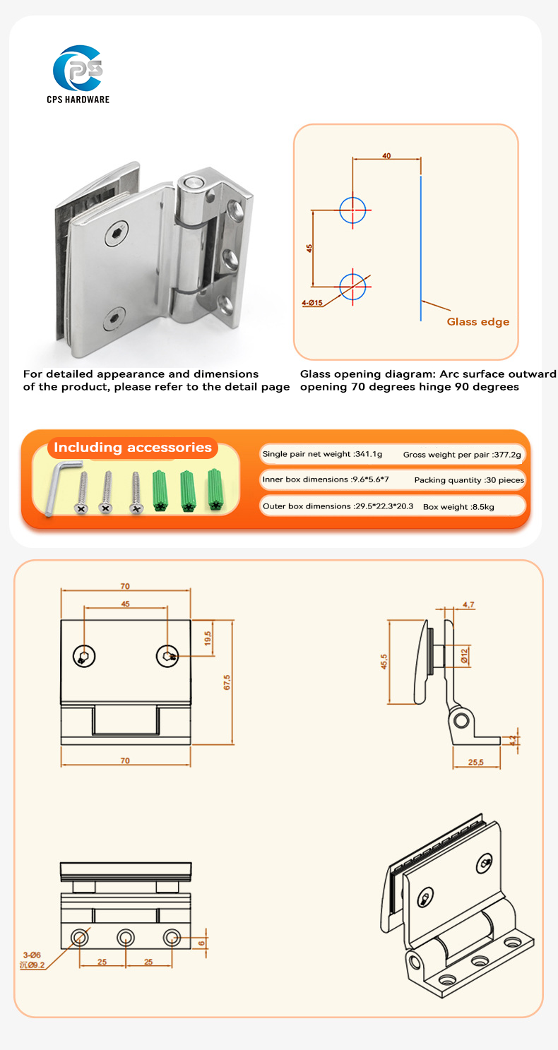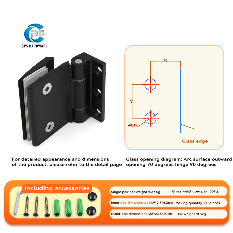The non-perforated glass door hinges feature protective pads, ensuring a secure and slip-resistant fit and preventing the glass from slipping. The hinges have a built-in positioning device to prevent the glass from opening automatically, allowing for easy and secure opening and closing.