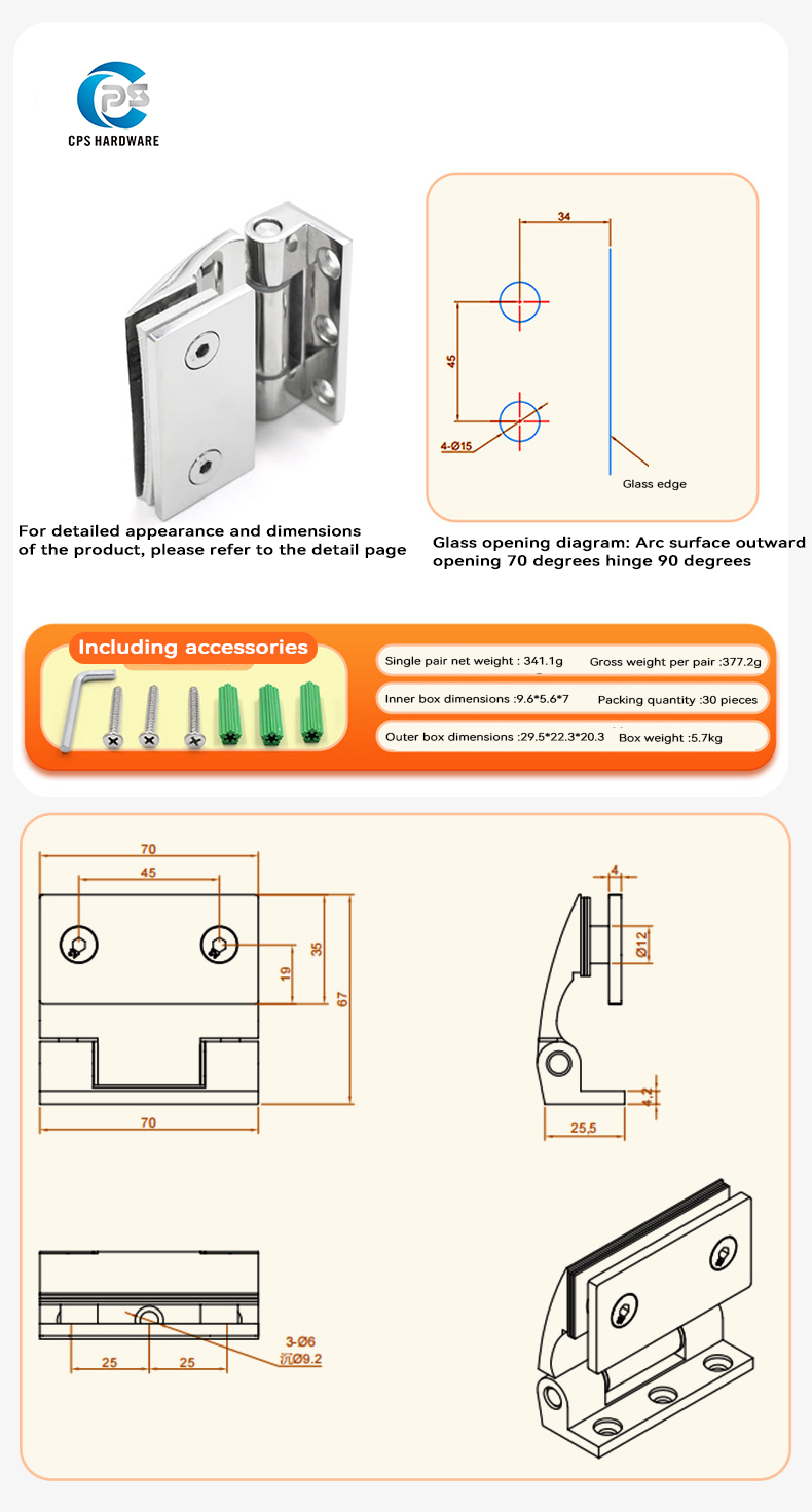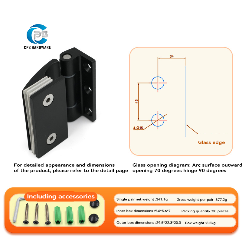 The non-perforated glass door hinges feature protective pads, ensuring a secure and slip-resistant fit and preventing the glass from slipping. The hinges have a built-in positioning device to prevent the glass from opening automatically, allowing for easy and secure opening and closing.