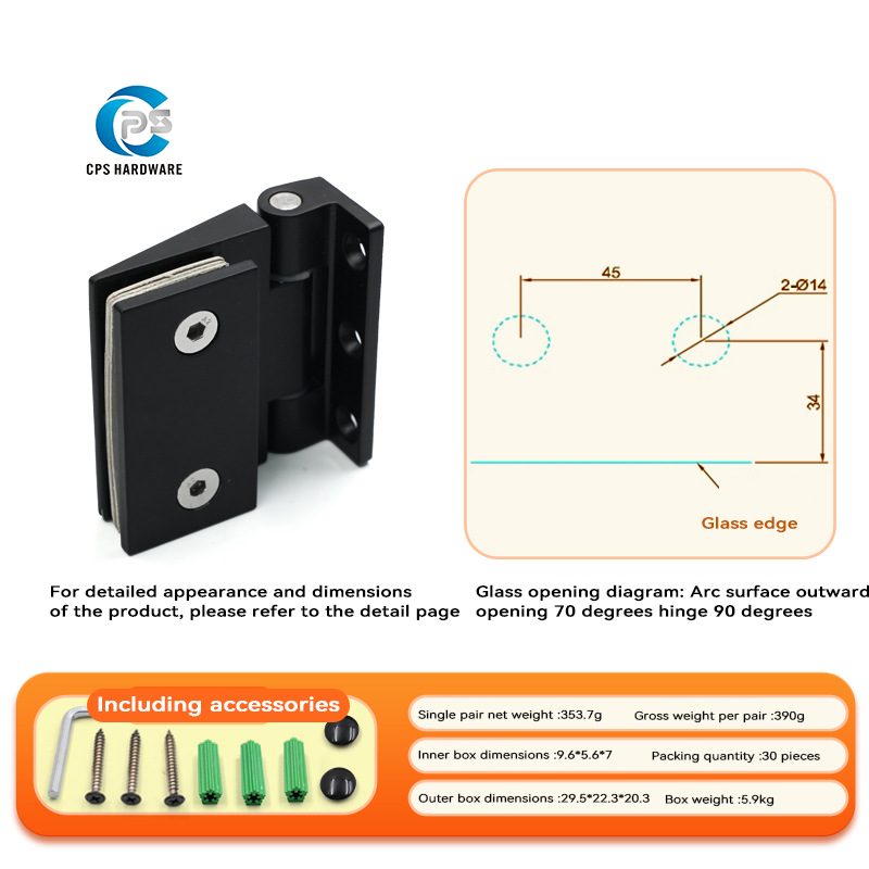 The non-perforated glass door hinges feature protective pads, ensuring a secure and slip-resistant fit and preventing the glass from slipping. The hinges have a built-in positioning device to prevent the glass from opening automatically, allowing for easy and secure opening and closing.