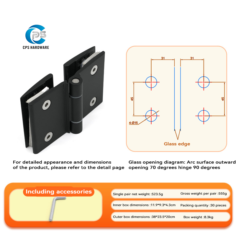 The non-perforated glass door hinges feature protective pads, ensuring a secure and slip-resistant fit and preventing the glass from slipping. The hinges have a built-in positioning device to prevent the glass from opening automatically, allowing for easy and secure opening and closing.