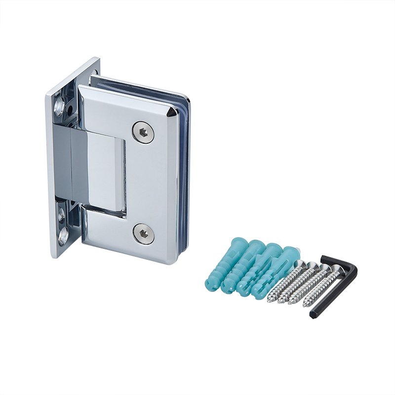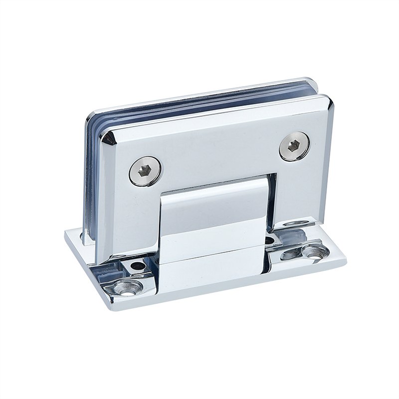 This 90-degree wall-to-glass hinge features four beveled corners, 90*55mm dimensions, a 58mm hole spacing, and anti-slip screws. The spacer between the clips can be PVC or asbestos, depending on the glass. Available materials include 304 stainless steel, 201 stainless steel, copper, or zinc alloy. The stainless steel is precision-cast, 5mm thick. It can also be welded to 4mm or 5mm thickness. It is spring-loaded and automatically closes when the door is closed to a 25° angle.