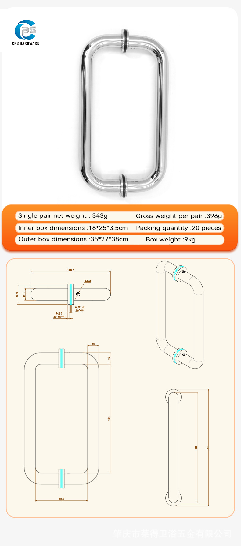 Package: Back to back tubular shower door pull handle