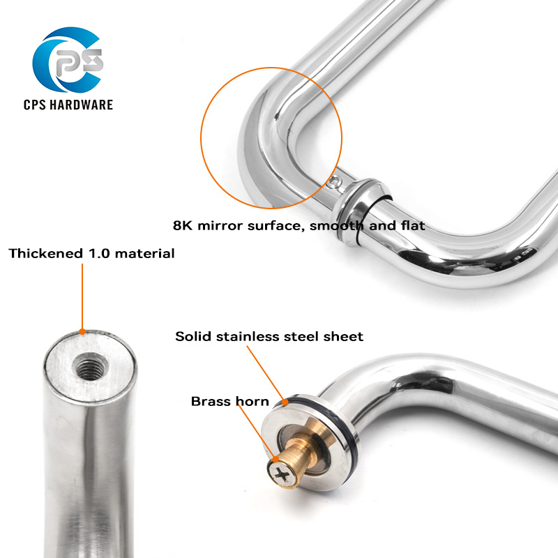 304/201 stainless steel Back-to Back Pull Handles fits heavy glass shower doors from 1/4″ glass thickness Glass Door Hole