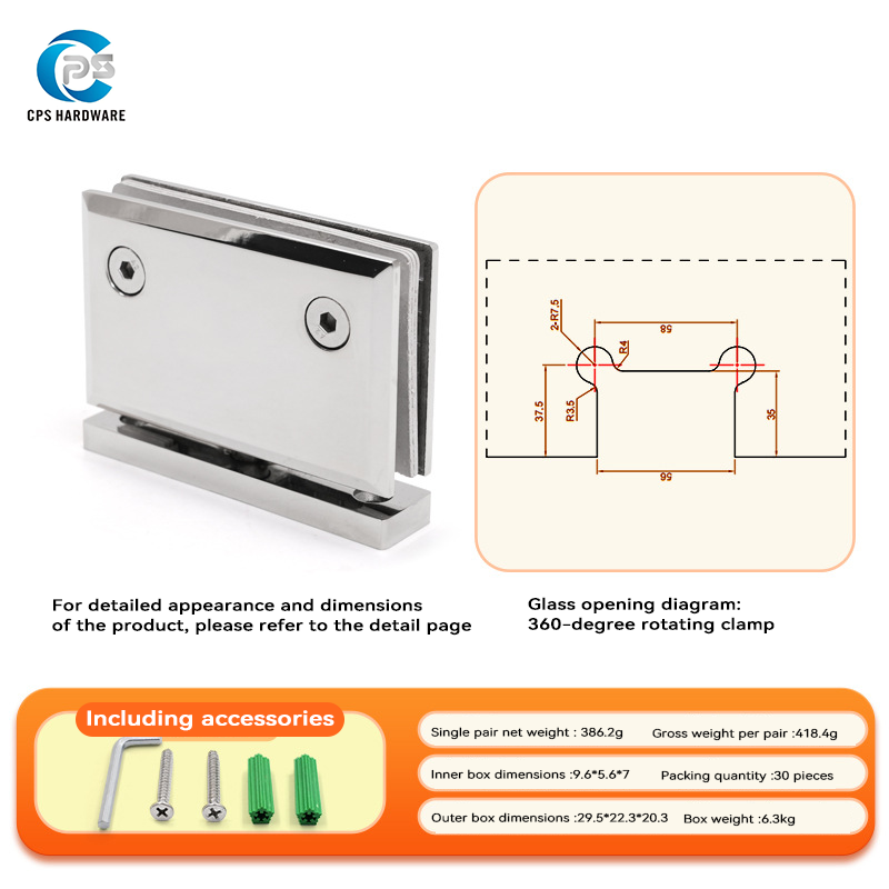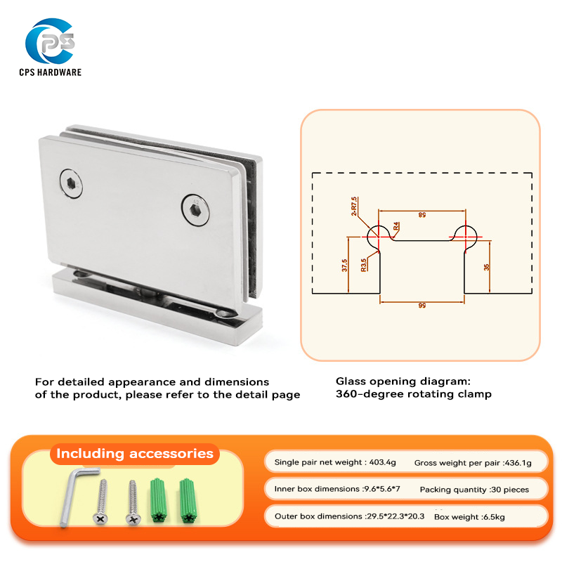 Bathroom door clamps, frameless glass door hinges, 360-degree rotating pivot hinges, 304 stainless steel glass clamps, 90° positioning door pivot hinge bearings C-094