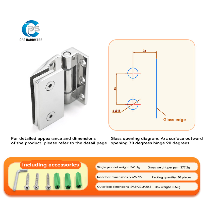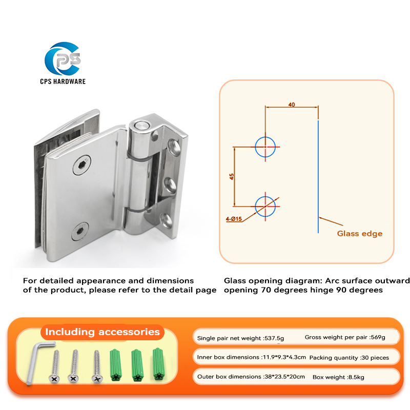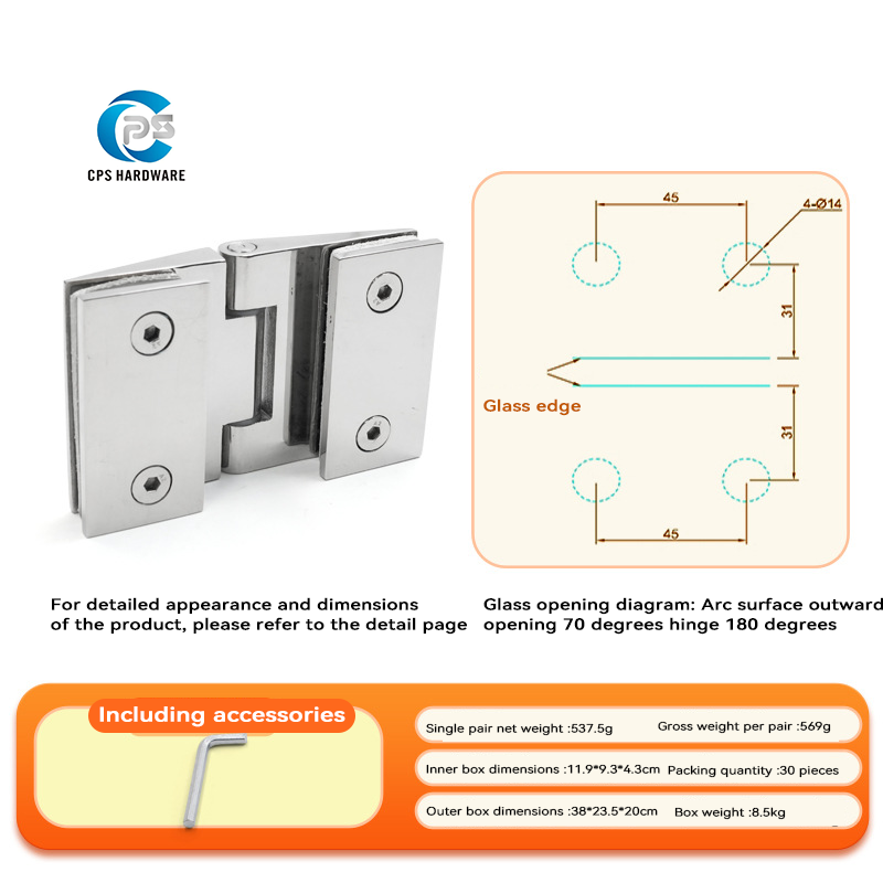 Flat stainless steel glass hinge, non-positioning glass hinge, 180° inward opening hinge C-089