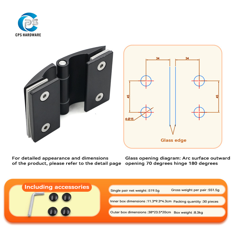 Curved stainless steel glass hinges, non-positioning glass hinges, 180° outward opening hinges C-087